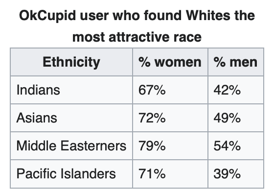 Les données du site « OKCupid » sont une source pratique pour analyser les préférences sexuelles, car elles demandent aux utilisateurs de remplir des quiz et des tests de personnalité dans le but de trouver un bon partenaire. L’une des questions posées était la suivante : « Sans vouloir être raciste, quelle ethnie trouvez-vous la plus attirante ? » (“Not to be racist but which ethnicity do you find to be most attractive?”).