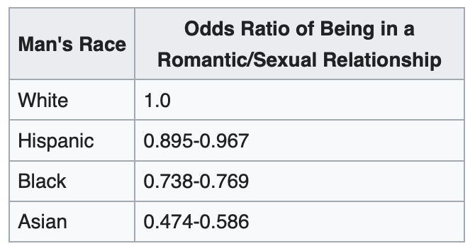 Dans l’ensemble, les hommes blancs avaient le plus de chances d’être en couple, suivis dans l’ordre par les hommes hispaniques, les hommes noirs et enfin, les hommes asiatiques. En fait, on a constaté que les hommes asiatiques avaient deux fois moins de chances que les hommes blancs d’être engagés dans une relation amoureuse, même en tenant compte d’un large éventail de caractéristiques. En revanche, les femmes asiatiques n’avaient pas moins de chances d’être en couple que les femmes blanches.