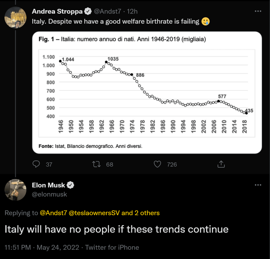 Cette fois, même Elon Musk en a parlé. Dans un tweet (voir ci-dessus), Mister Tesla s’est montré préoccupé par la disparition probable de la population italienne.