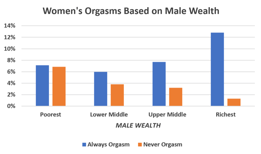 Il a été constaté qu’il existait une corrélation significative entre la fréquence des orgasmes des femmes et le revenu annuel du partenaire, mais qu’il n’existait aucune corrélation significative entre la fréquence des orgasmes et la taille du partenaire.