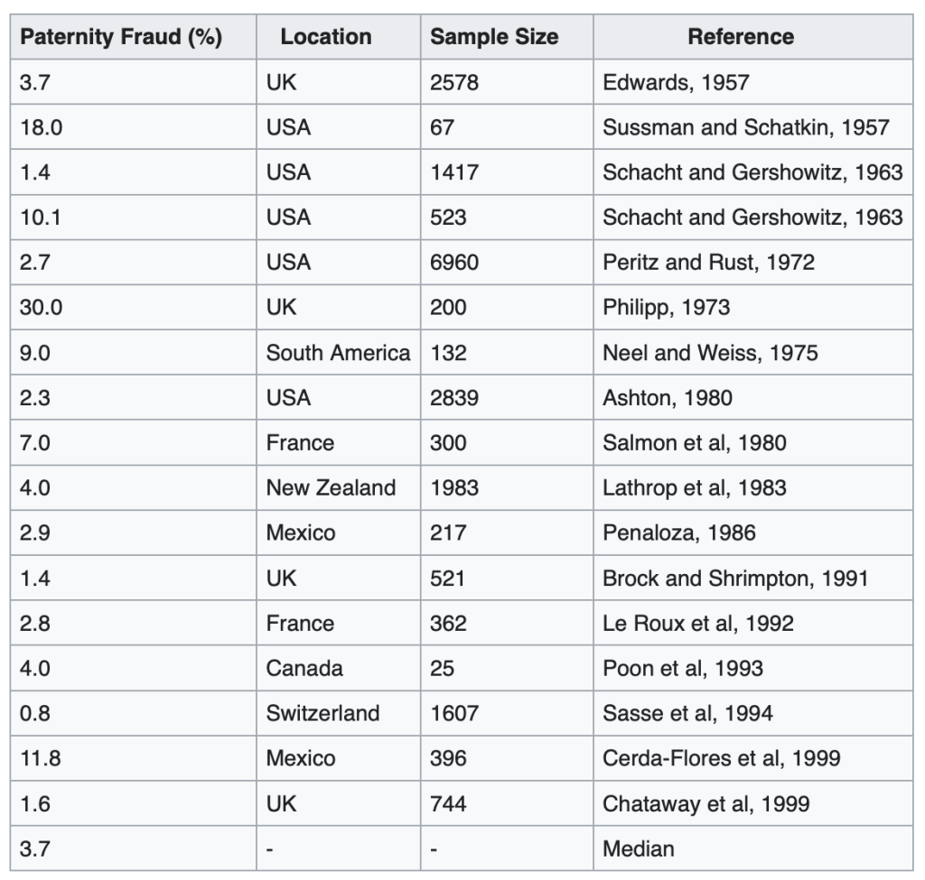 Une étude publiée dans le « Journal of Epidemiology and Community Health » (2005) a conclu que dans les cas où la paternité était contestée, 26,9 % des cas présentaient une « discordance de paternité » (c’est-à-dire, en langage clair, une fraude à la paternité). Dans la population générale où les enfants ont été testés de manière plus aléatoire par des tests sanguins ou des marqueurs génétiques pour évaluer leur paternité, le taux médian de fraude à la paternité était de 3,7 %, avec des études allant de 0,8 % à… 30 % ! Les chiffres les plus élevés sont probablement des valeurs aberrantes. En combinant tous les échantillons, on obtient un taux de fraude à la paternité de 3,36 %.