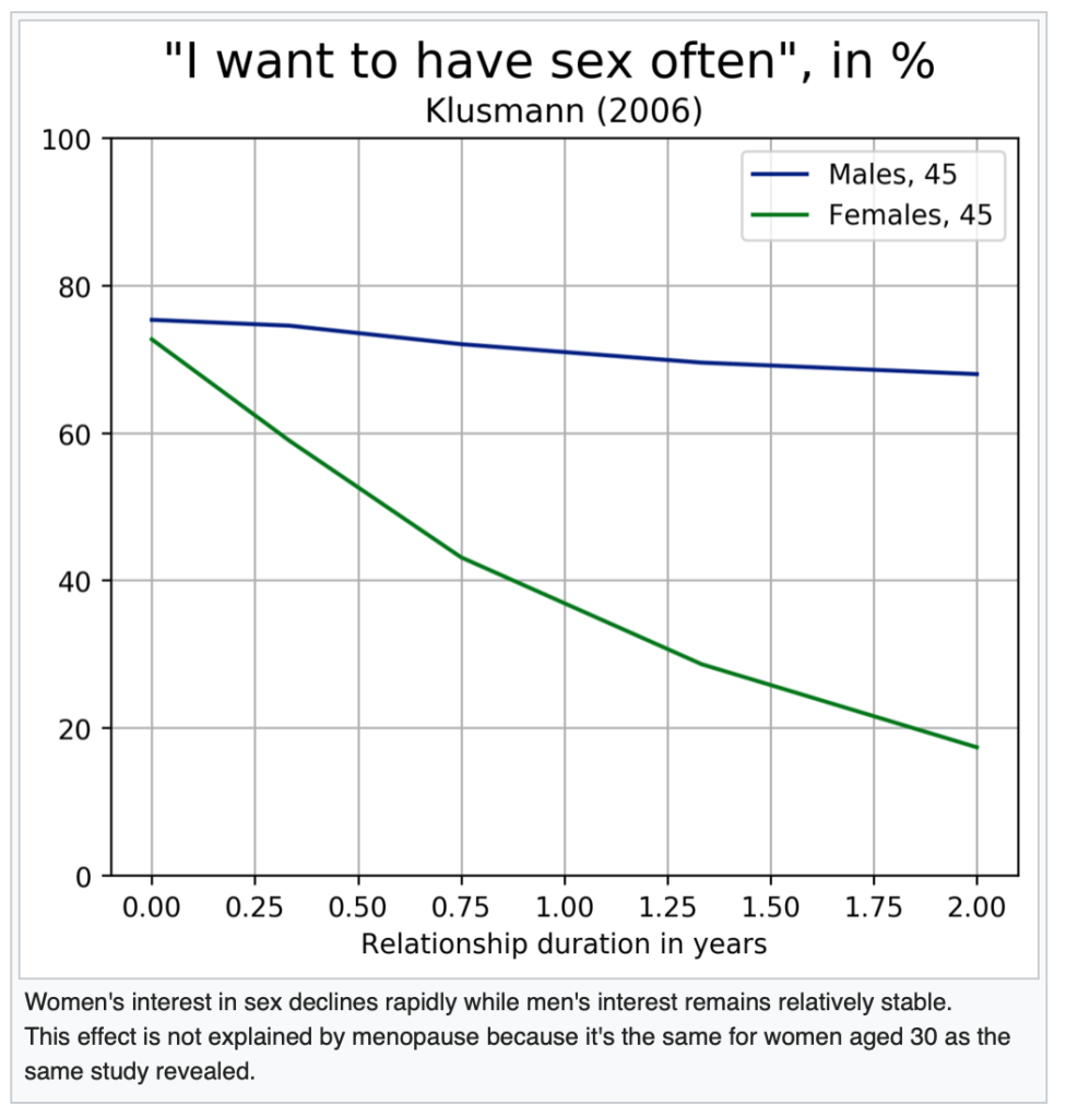 Il a été constaté que le désir sexuel masculin restait constant, voire augmentait tout au long de la relation, tandis que le désir sexuel féminin diminuait avec le temps, mais que le désir de « tendresse » des hommes diminuait et que le désir de « tendresse » des femmes restait généralement constant.