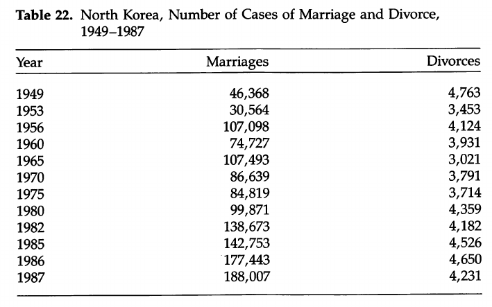 Contrairement à l’URSS, la Corée du Nord n’a pas connu une première phase de libéralisation qui a été dépassée par la suite : le divorce, légalisé par l’article 5 de la loi sur l’égalité des sexes (30 juillet 1946), n’est jamais devenu un phénomène de masse car en cas de désaccord entre les parties, il faut aller au tribunal, celui qui demande le divorce plus de deux fois est condamné à une amende de 5.000 wons et, à partir de mars 1956, même les divorces consensuels font l’objet d’une procédure judiciaire ».