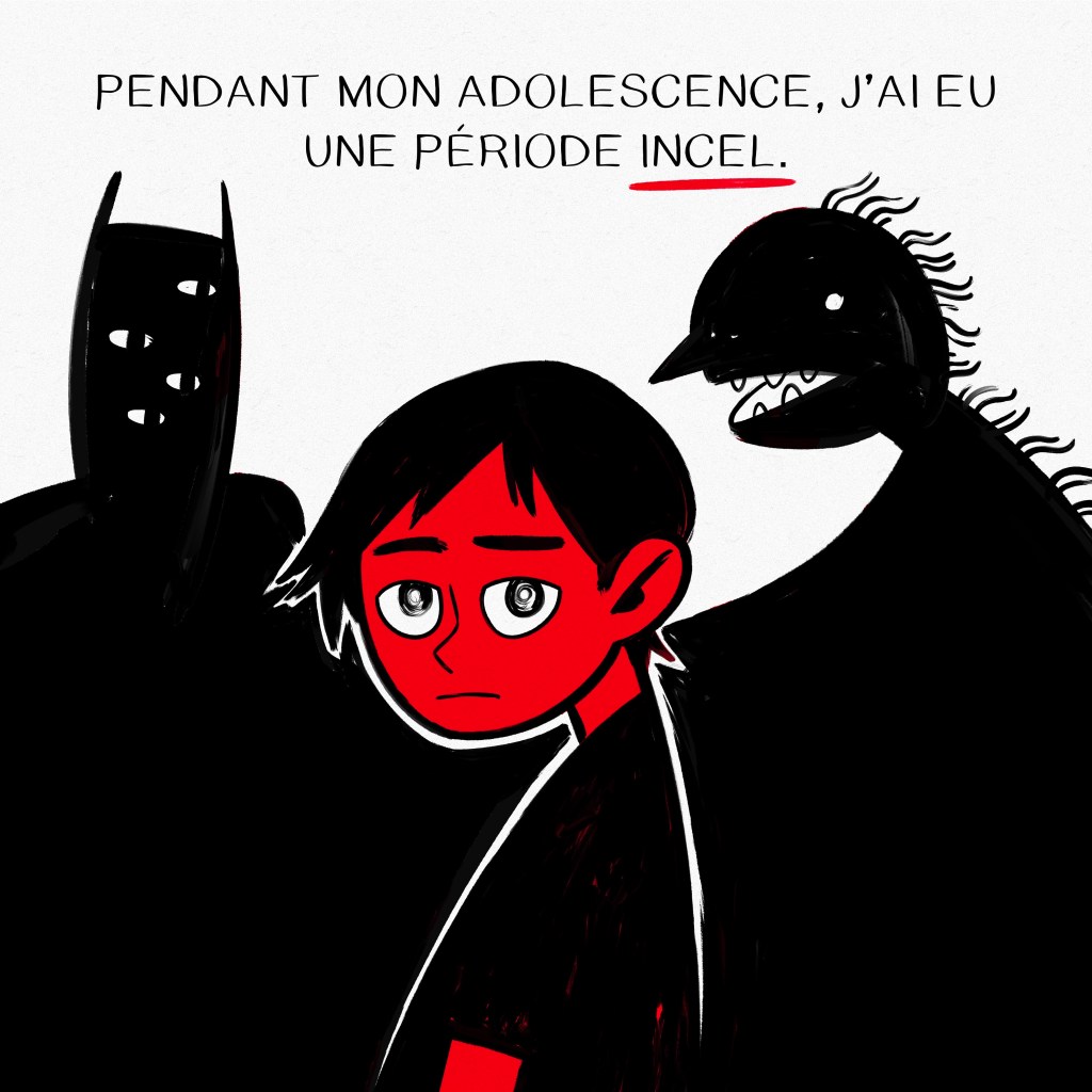Si je résume, un type souffrant d’anxiété sociale découvre des influenceurs d’extrême-droite sur internet et réalise qu’il considère ces influenceurs comme sexiste et raciste, et en conséquence, il se met à dessiner pour se reconnecter avec ses émotions et cela lui permet de ne plus se haïr.